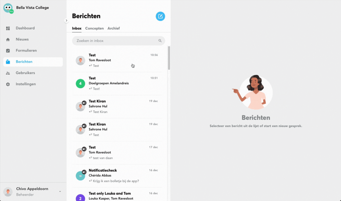 Met de zoekfunctie in het tabblad Berichten kun je snel terugvinden wat je eerder hebt verstuurd of ontvangen. Handig als je bijvoorbeeld veel communiceert of regelmatig iets moet terugzoeken.